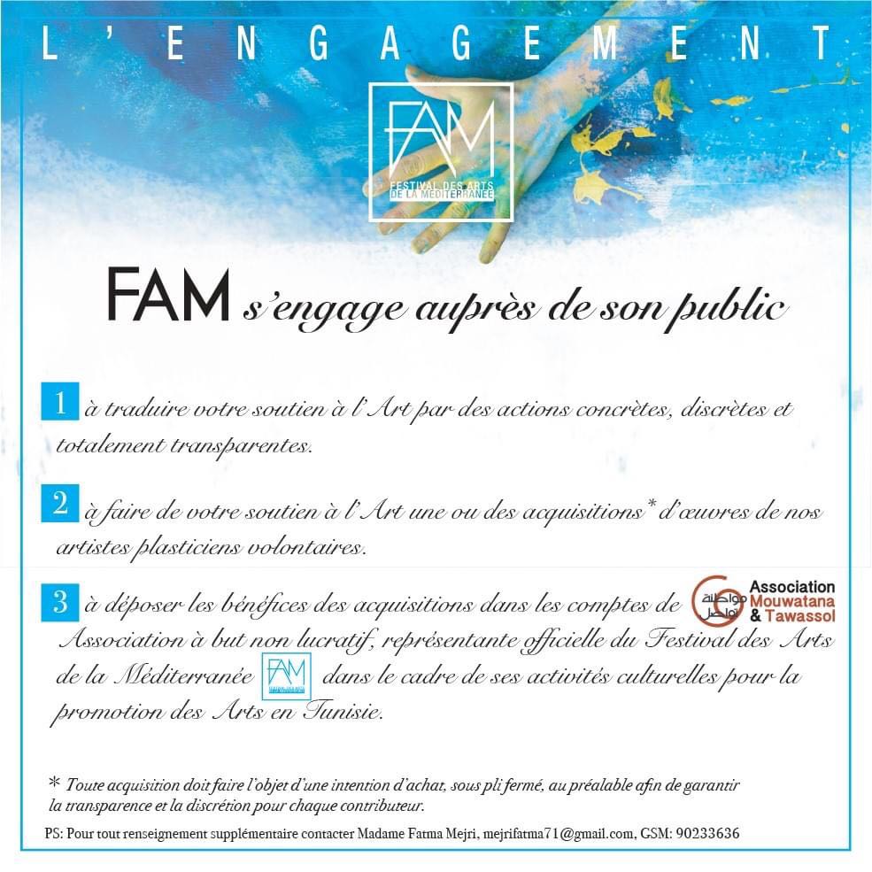 « Plus que n’importe qui, l’artiste aujourd’hui a besoin de solidarité et d’aide, votre présence est plus que souhaitable les amis ! » Mohamed Samir TURKI, Directeur-Fondateur de FAM;