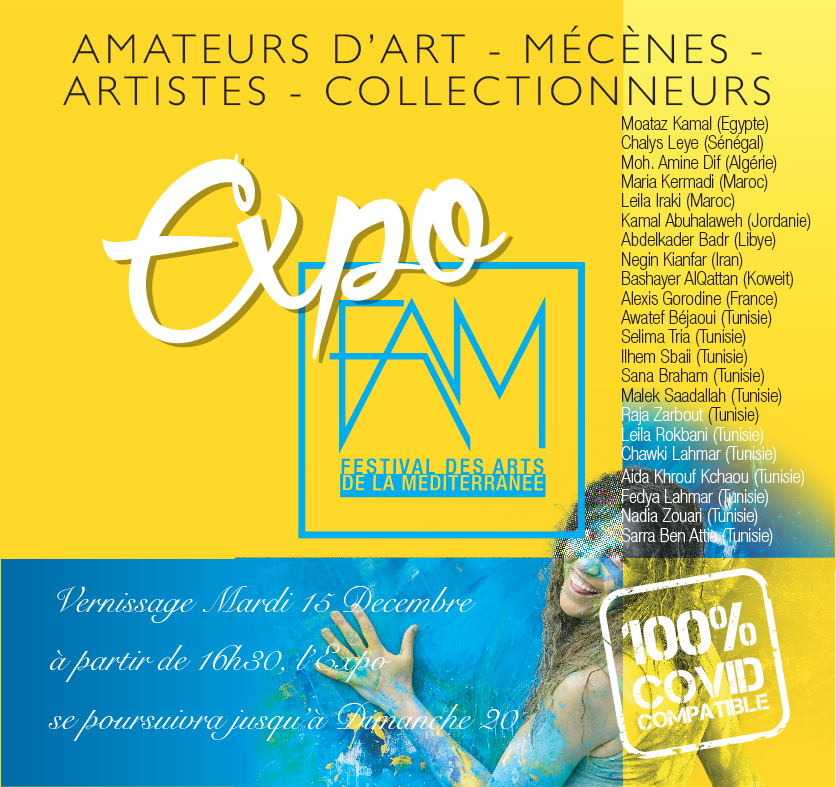 Exposition internationale FAM* à la Galerie Hédi Turki de Sidi Bou Saïd du Mardi 15 au Dimanche 20 Décembre 2020. Plus de 50 oeuvres d’artistes venus de Tunisie, Maroc, Algérie, Egypte, Jordanie, Libye, Iran, Koweit, Sénégal et France. Entrée libre.
