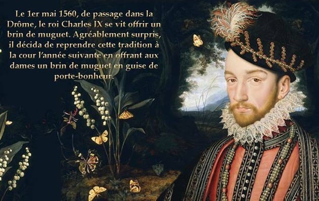 Offrir traditionnellement du Muguet le 1er Mai n’a donc à l’origine rien d’un acte syndicaliste. La légende veut qu’en 1560, Charles IX (qui vient d’accéder au trône après la mort prématurée de son frère François II) et sa mère Catherine de Médicis visitent le Dauphiné où le chevalier Louis de Girard de Maisonforte, dans le jardin de son domaine à Saint-Paul-Trois-Châteaux, dans le sud de la Drôme, offre au jeune roi un brin de muguet : “Sire, que ce muguet tricastin vous porte bonheur”. Le roi, charmé, reprend cette pratique d’offrir chaque printemps un brin de muguet à chacune des dames de la cour en disant « Qu’il en soit fait ainsi chaque année », la coutume s’étendant rapidement à travers tout le pays.