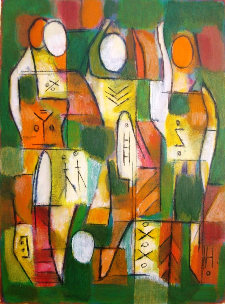 Avec toute une gamme de tonalités chaudes pour revêtir ses tableaux de rouge pourpré, d’ocre et de jaunes ensoleillés, avec une gamme plus froide et aérienne de vert-violets et de blancs-bleutés rappelant le ciel et la mer, Khaled Lasram réemploi dans la structure et le fonds de ses toiles le patrimoine naturel et culturel de son pays. Calligraphie arabe, tissage coutumier (margûms, kilims), tatouages tribaux, stèles puniques, mosaïques antiques, et même l’art pariétal, tout en évitant le folkorisme (hélas si présent dans l’artisanat), le Professeur Khaled Lasram produit des compositions abondantes de sujets et d’objets identitaires qu’il réinterprète et stylise.