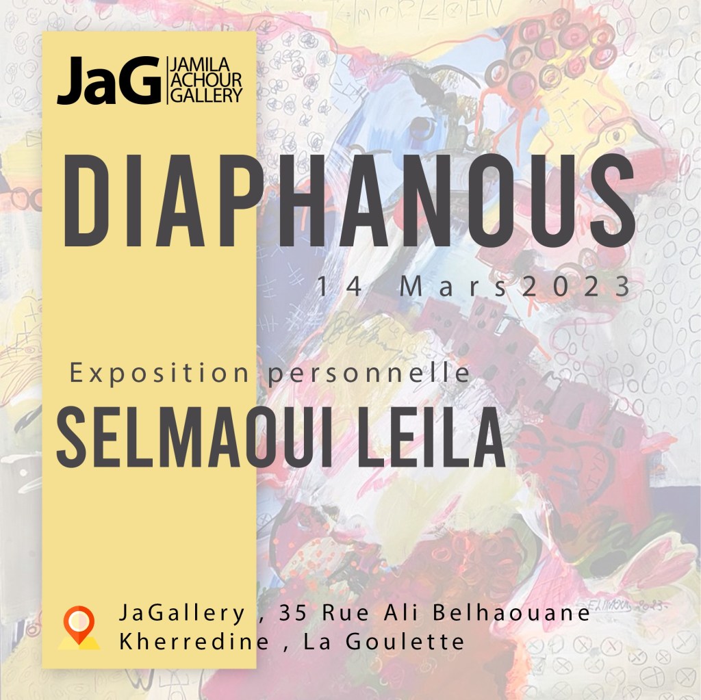 Exposition personnelle de l’artiste-peintre tunisienne Leïla SELMAOUI du 14 au 22 Mars 2023 à la Jamila Achour Gallery (35 rue Ali Belhaouane Kherredine La Goulette 2060 , Tunisie). 25 tableaux inédits (peinture acrylique).