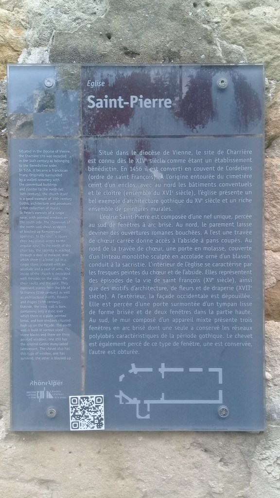 🌳 Le Prieuré de Charrière, construit au XIe siècle, témoigne de l’histoire riche et mouvementée de la région. Ancien prieuré bénédictin dépendant de Manthes (le Prieuré clunisien de Manthes à 12 km de Charrière dans le village homonyme existe toujours) et rattaché à l’abbaye de Cluny. Au milieu du XVe devant le mauvais état de cette église les comtes de Montchenu (grande famille du Dauphiné) implantent une communauté de Franciscains de la stricte observance pour remplacer les bénédictins défaillants. Ce changement fut contesté par les occupants des lieux mais en 1456 les Franciscains s’installent à Charrière, ils reconstruisent l’église et en font la chapelle de leur couvent. L’église paroissiale est alors transférée dans la chapelle du château des Montchenu. Les nouveaux arrivants rebâtirent l’église dans le style gothique mais la nef ne sera voûtée qu’au XVIIe siècle. Le chœur voûté de cette chapelle gothique renferme encore des peintures murales des XV et XVIIe siècles. Ils agrandirent le couvent, qui sera brûlé en 1567, au moment des guerres de Religion puis reconstruit. Les frères resteront pendant 350 ans et seront chassés par la révolution, qui détruira notamment le clocher. Les bâtiments seront vendus comme biens nationaux au moment en 1796. En 1833 cette chapelle est redonnée à la commune pour lui rendre sa fonction d’église paroissiale car celle du château, restée sans entretien depuis la révolution et le départ des Montchenu, est à la fois en mauvais état et trop petite pour une communauté qui se développe. Charrière redevient donc église paroissiale en 1834 mais, autour de la chapelle du château devenue église paroissiale en 1456 une vie cultuelle s’est organisée puis un village s’est créé. Ce changement transfère donc l’église paroissiale de ce village à plus de 2 km, aussi la contestation a amené à la construction d’une nouvelle église dans le bourg inaugurée 14 ans plus tard en 1848. Charrière redevient alors une chapelle de quartier, publique d’abord puis privée après 1905 et le transfert de la gestion de cette chapelle à 6 habitants de ce hameau. Rapidement les nouveaux responsables vont se décourager, elle tombera en désuétude et perdra sa consécration à une date inconnue, sans doute juste avant la seconde guerre mondiale. Devenue bâtiment civil elle servira d’abord de théâtre puis d’entrepôt puis plus à rien et personne ne s’intéressera à ce qui est devenu presque une ruine jusqu’en 1991.