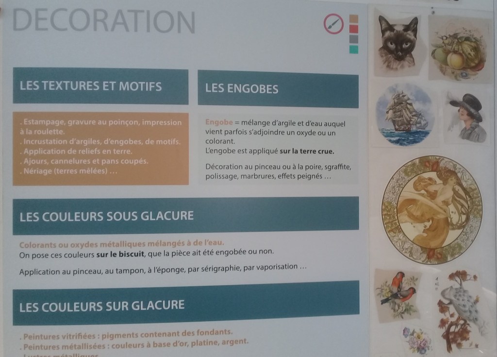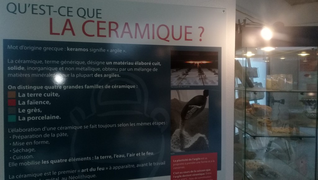 Des créations antiques aux pièces contemporaines, une diversité impressionnante d’oeuvres (> 300 objets) sont présentées. Immersion complète dans l’univers de la céramique en général, un parcours d’exposition permanente avec panneaux pédagogiques est organisé autour d’îlots thématiques (matières premières, fabrication, décoration, savoir-faire ; etc.). Des films présentent les procédés de fabrication. Une heure de visite environ suffit pour mieux comprendre l’histoire et les techniques de la céramique et s’initier à cet art et artisanat ancestral.