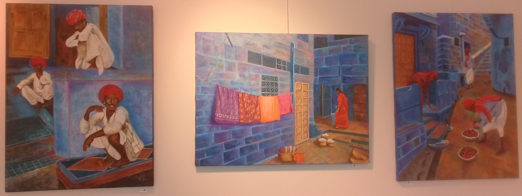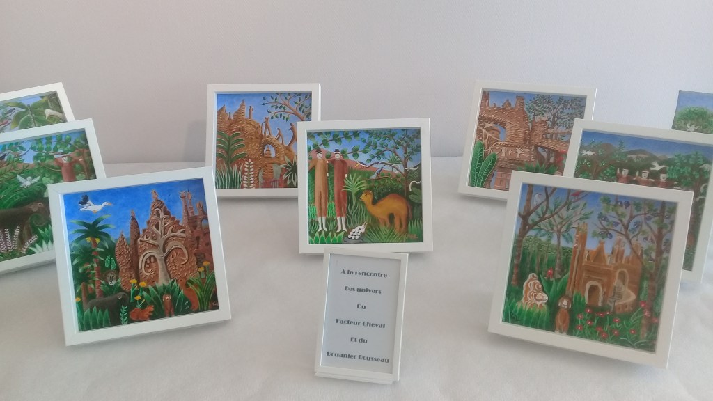 L’une mettait en scène des fruits avec un style figuratif vibrant de couleurs. Une autre présentait des peintures de souliers inspirés des chaussures géantes de Roman-sur-Isère, ville drômoise célèbre pour sa haute tradition dans la confection (« capitale de la chaussure »), et où le Musée de la Chaussure est une référence internationale. Dans une autre section, la plus fournie, les tableaux présentés étaient des pastiches du fameux peintre Douanier-Rousseau (1844-1910), intégrant des références à son contemporain le Facteur Cheval (1836-1924), l’un des personnages les plus célèbres de l’histoire de la Drôme des Collines. Combinant le style junglesque et exotique de Rousseau avec des éléments caractéristiques du Palais Idéal, ces œuvres originales offraient des scènes à la fois familières, fantastiques et énigmatiques. Enfin, l’artiste hauterivoise nous transportait à Jodhpur, la célèbre ville bleue d’Inde. En trois tableaux, elle a peint la singularité de cette ville, ses rues animées et l’atmosphère unique de cette destination touristique prisée, et où la plupart des maisons sont bleues.