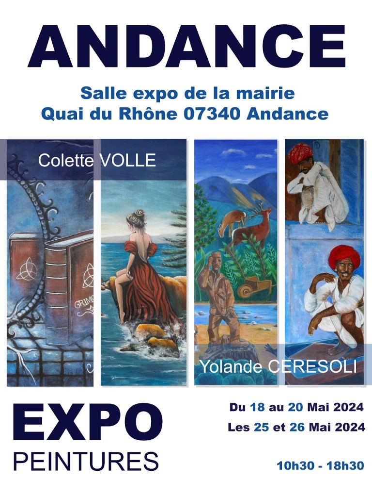La récente exposition de Yolande Ceresoli, en duo avec son amie peintre Colette Volle, du 18 au 26 mai 2024, dans la charmante nouvelle galerie d’art d’Andance, a dévoilé plusieurs séries très variées de ses tableaux.