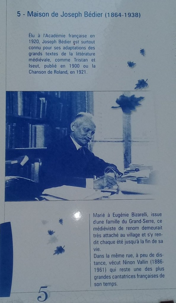 Une autre personnalité locale, dont le souvenir est gardé, est l’académicien Joseph Bédier (1864-1938) Philologue spécialiste de la littérature médiévale et adaptateur renommé de l’épopée de Tristan et Iseult, il vécut plusieurs années au Grand-Serre, jusqu’à sa mort le 29 août 1938.