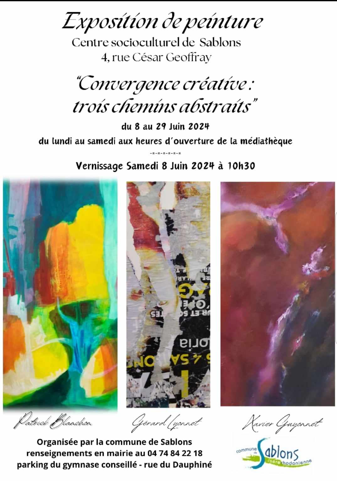 Exposition de peinture TROIS CHEMINS ABTRAITS (Patrick Blanchon, Gerard Lyonnet et Xavier Guyonnet) du 8 au 29 juin 2024 au Centre Culturel de SABLONS 38550