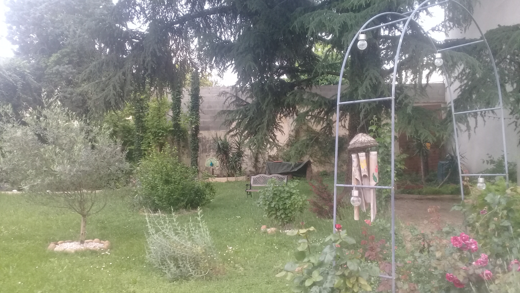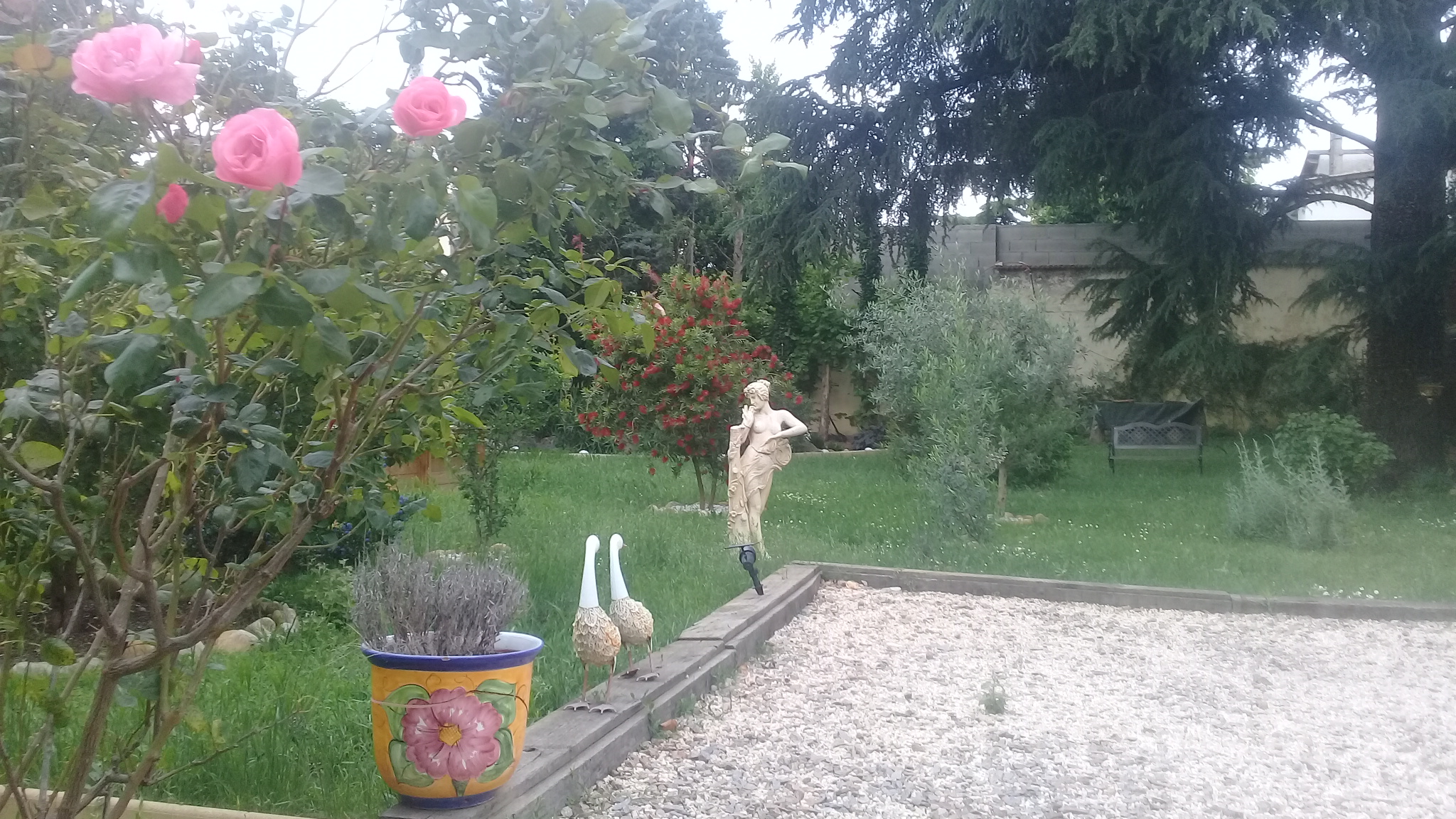 Dans le jardin privé de Rose-Lavande, maison d’hôtes au coeur du village de Saint-Rambert-d’Albon, Drôme, existe un discret havre de paix. Dès l’entrée du convivial royaume de Fabienne et Armand, le parfum envoûtant des roses vous attrape, vous enveloppe et vous guide vers une grande cour arborée. De là, un jardin d’un vert intense et soigneusement fleuri vous accueille. Un banc en bois sous un grand cèdre vous invite à vous asseoir, à admirer. Espace ombragé parfait, le murmure du vent dans les branches pour seul distraction, une statuaire originale, inspiré, et astucieusement dispersé aux quatre coins du parc, créé une atmosphère d’évasion à la fois romantique, paisible et exotique. La vue sur l’ensemble de ce jardin impeccablement tenu favorise la contemplation, méditation et sérénité. Endroit parfait pour profiter de la douceur de vivre en Drôme des Collines, pour se poser, s’apaiser, respirer, et laisser très vite les soucis s’évaporer, le vrai luxe c’est peut-être là.