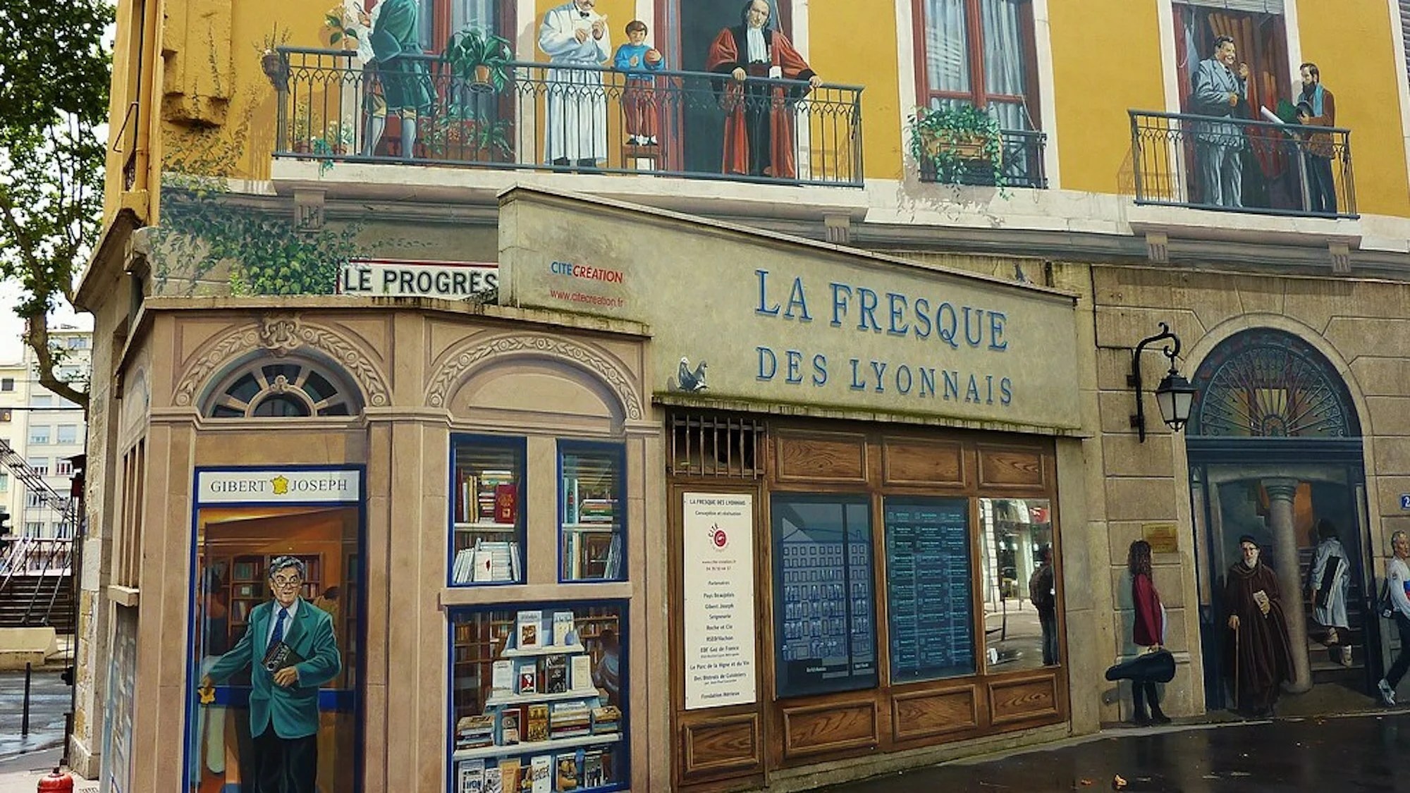 Dans la région, la fresque de référence, l’une des plus célèbre et réussie de France, est la Fresque des Lyonnais. Réalisée en 1995 (commandée par Michel Noir, Maire de l’époque) par CitéCréation, la fresque met en scène 24 personnages historiques lyonnais sur une façade d’immeuble de 6 étages (soit 800 m²) du 1er arrondissement, près de l’Hôtel de Ville et de la Place des Terreaux. De Saint-Irénée et Sainte-Blandine aux frères Lumière et Saint-Exupéry, en passant par Paul Bocuse et l’abbée Pierre, les plus illustres lyonnais de l’Histoire ont été sélectionnés parmi 250 personnalités répertoriées pour être immortalisés tous ensemble.