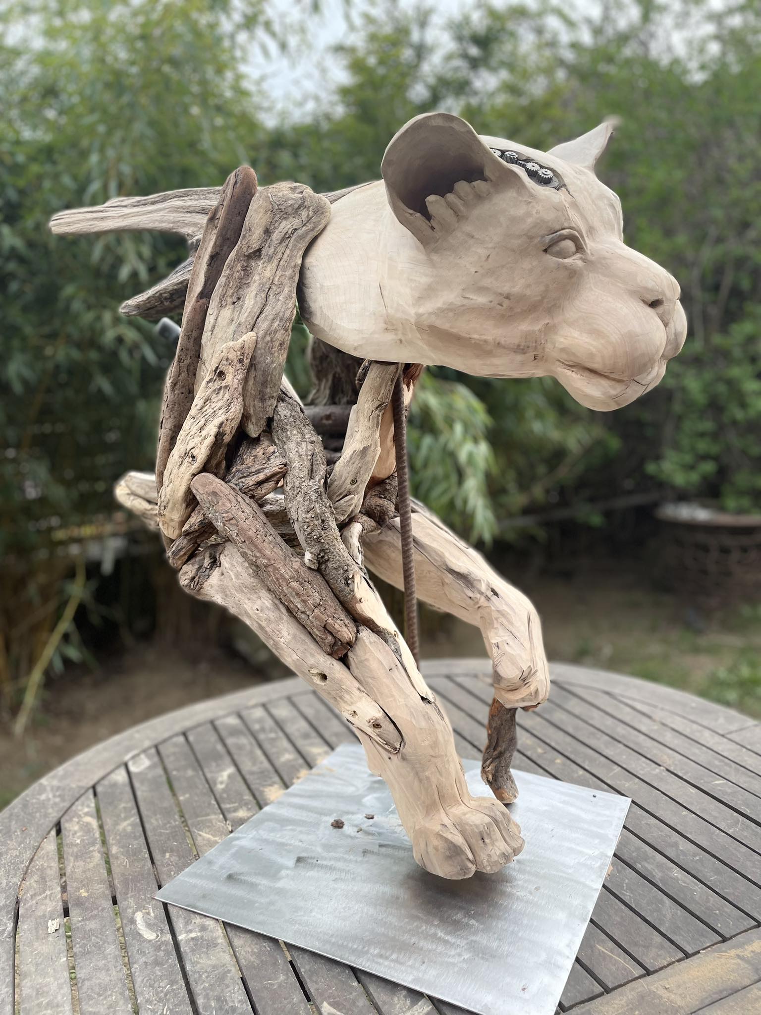đ Une lionne sculptĂ©e en bois flottĂ©, Ă la fois majestueuse, Ă©nigmatique et profondĂ©ment contemporaine.
