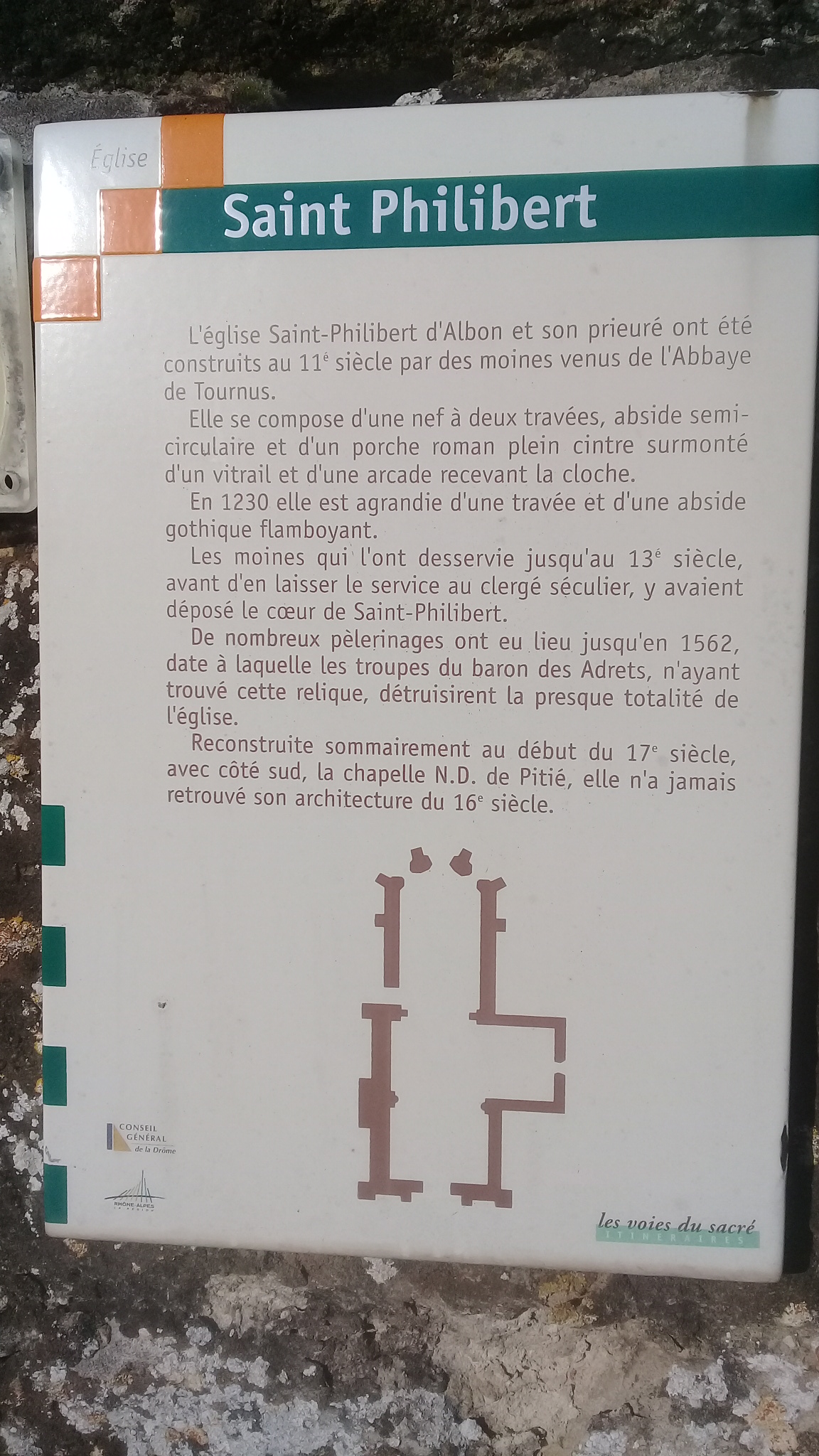 L’église Saint-Philibert d’Albon (Drôme), mentionnée dès 1119, fut fondée au XIe siècle par des moines bénédictins venus de l’abbaye Saint-Philibert de Tournus (Saône-et-Loire). Ce prieuré, possession de Tournus jusqu’au XIIIe siècle, conservait le cœur de saint Philibert, relique vénérée qui attira de nombreux pèlerins. Agrandie en 1230 avec l’ajout d’une abside gothique, l’église connut son apogée médiéval avant d’être dévastée le 15 juillet 1562 par les troupes du baron des Adrets lors des guerres de Religion. Les soldats protestants, n’ayant pas trouvé la relique du cœur de saint Philibert qu’ils cherchaient, détruisirent la quasi-totalité de l’édifice. Reconstruite sommairement au début du XVIIe siècle avec l’ajout de la chapelle Notre-Dame-de-Pitié financée par la famille des Izeran, l’église ne retrouva jamais son architecture romane d’origine. À la fin du XXe siècle, une campagne de restauration importante permit de préserver les éléments romans subsistants : le mur nord de la nef, la partie inférieure de la façade occidentale et le remarquable portail du XIIe siècle orné de fleurons imitant l’antique. Aujourd’hui, cette église témoigne de l’influence monastique bourguignonne en Dauphiné et du rôle d’Albon comme berceau de la dynastie comtale à l’origine du Dauphiné.