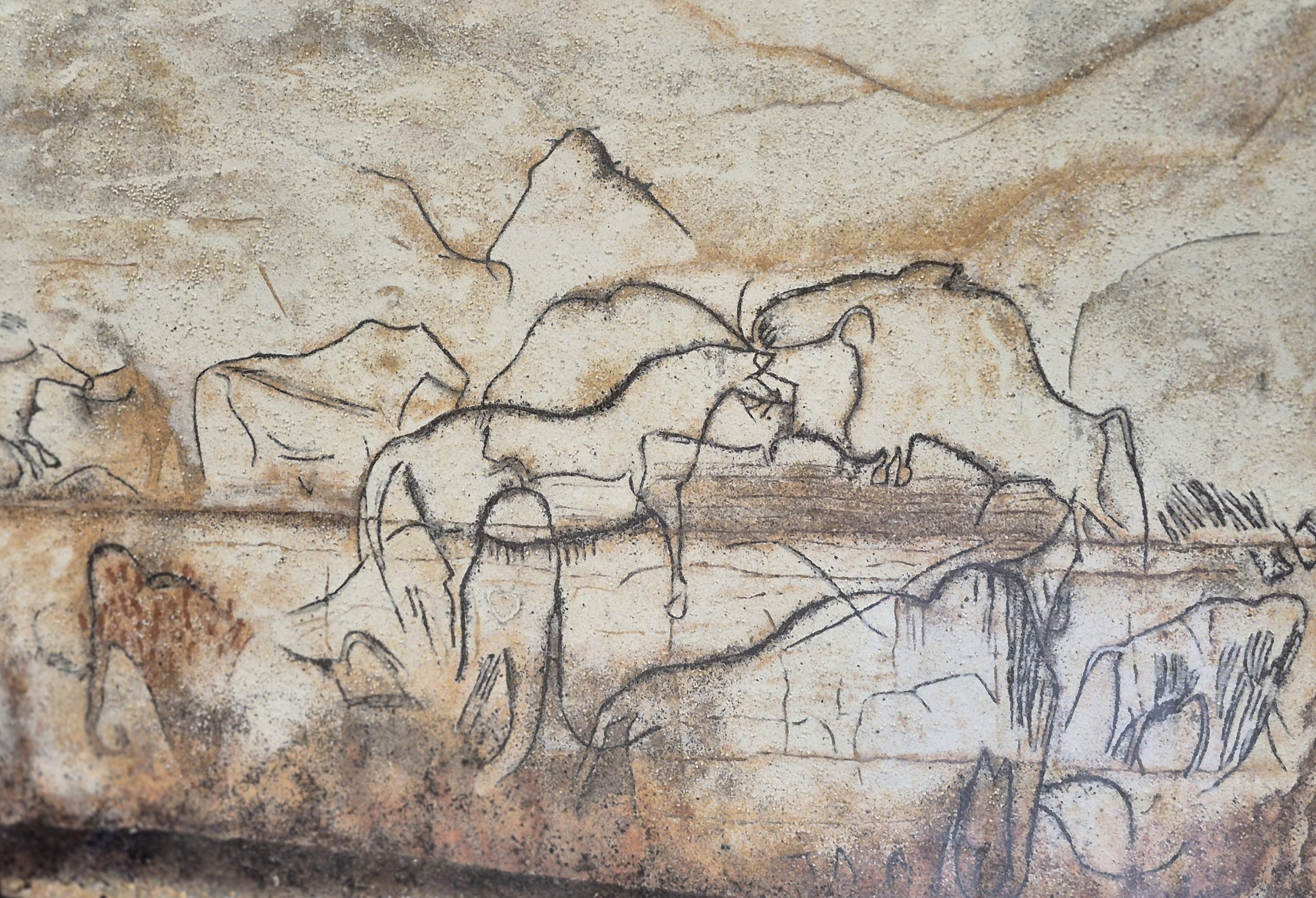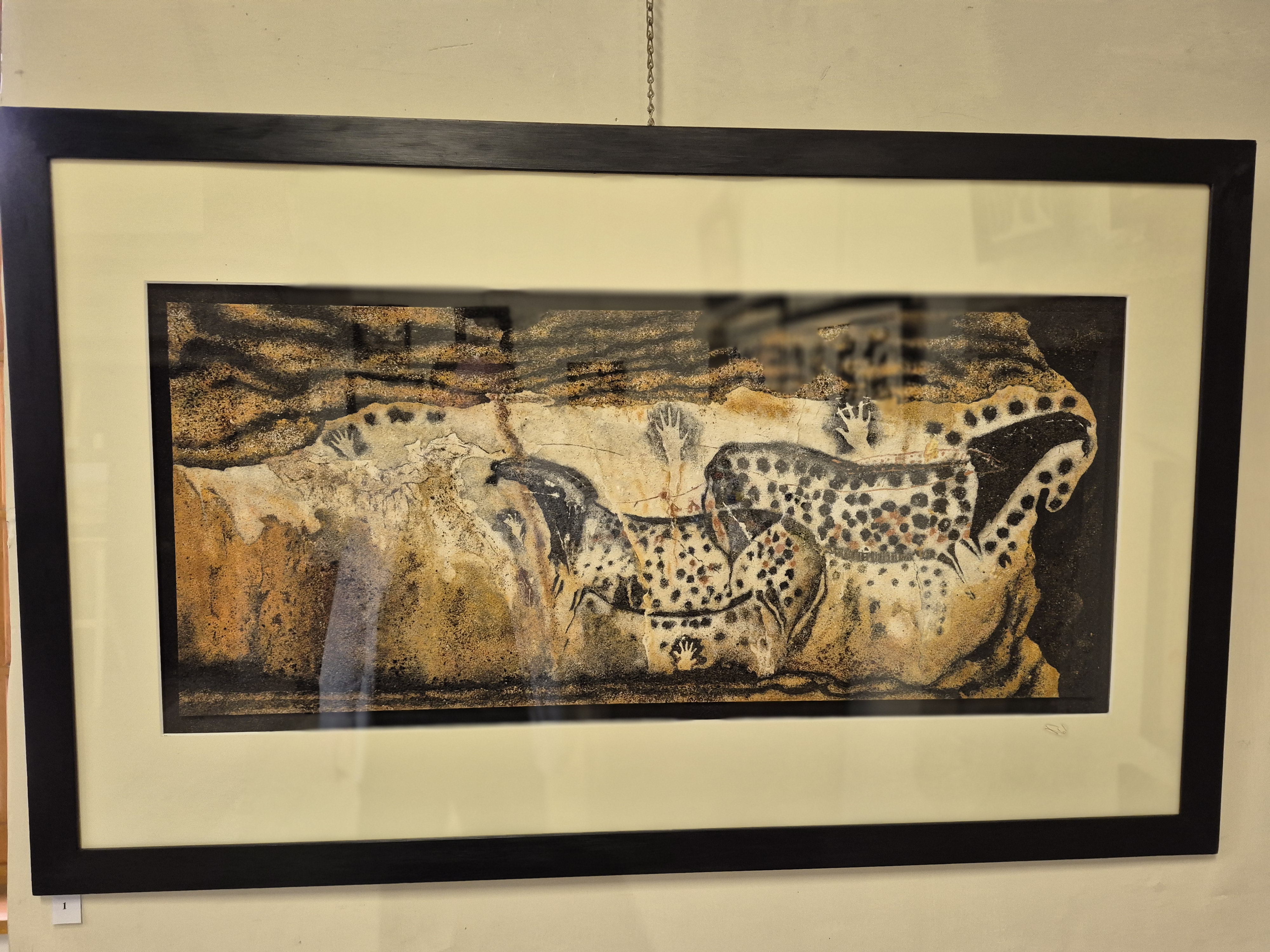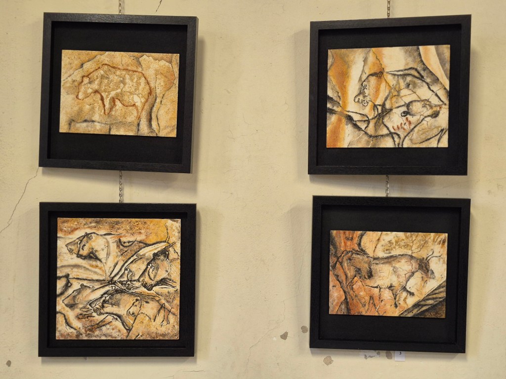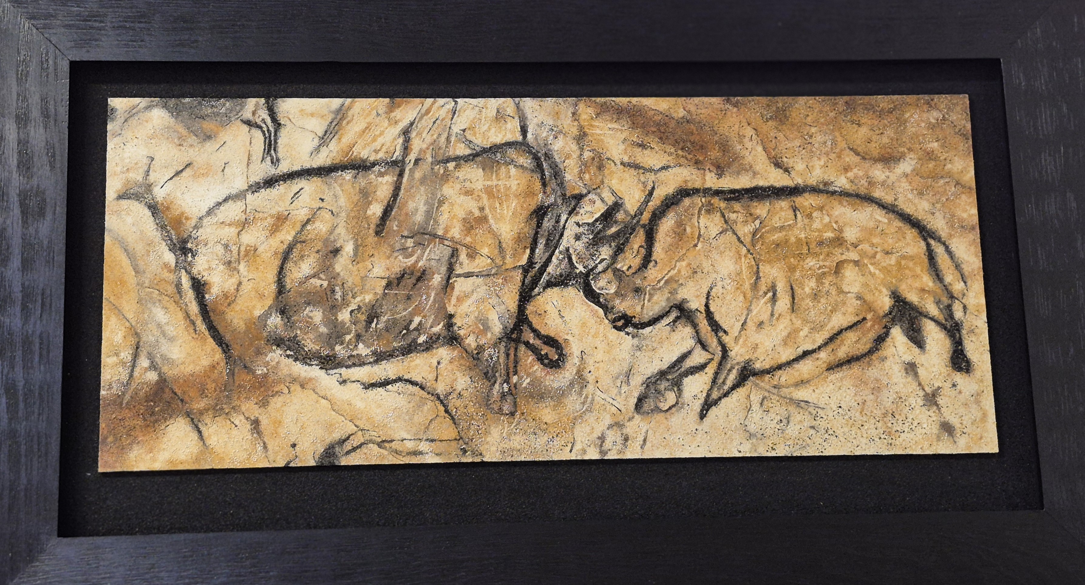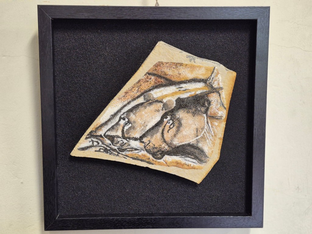 Dans sa collection Art Rupestre, le sable fait bien plus qu’illustrer la grotte Chauvet : il reproduit sa matière même. Quand on approche les tableaux à quelques centimètres, on voit la minéralité du support qui épouse celle du sujet. C’est une forme de vérité plastique qu’aucune peinture sur toile ne peut offrir — et Gérard m’a confirmé qu’il sélectionne ses sables volcaniques noirs précisément pour retrouver la gamme des pigments aurignaciens.