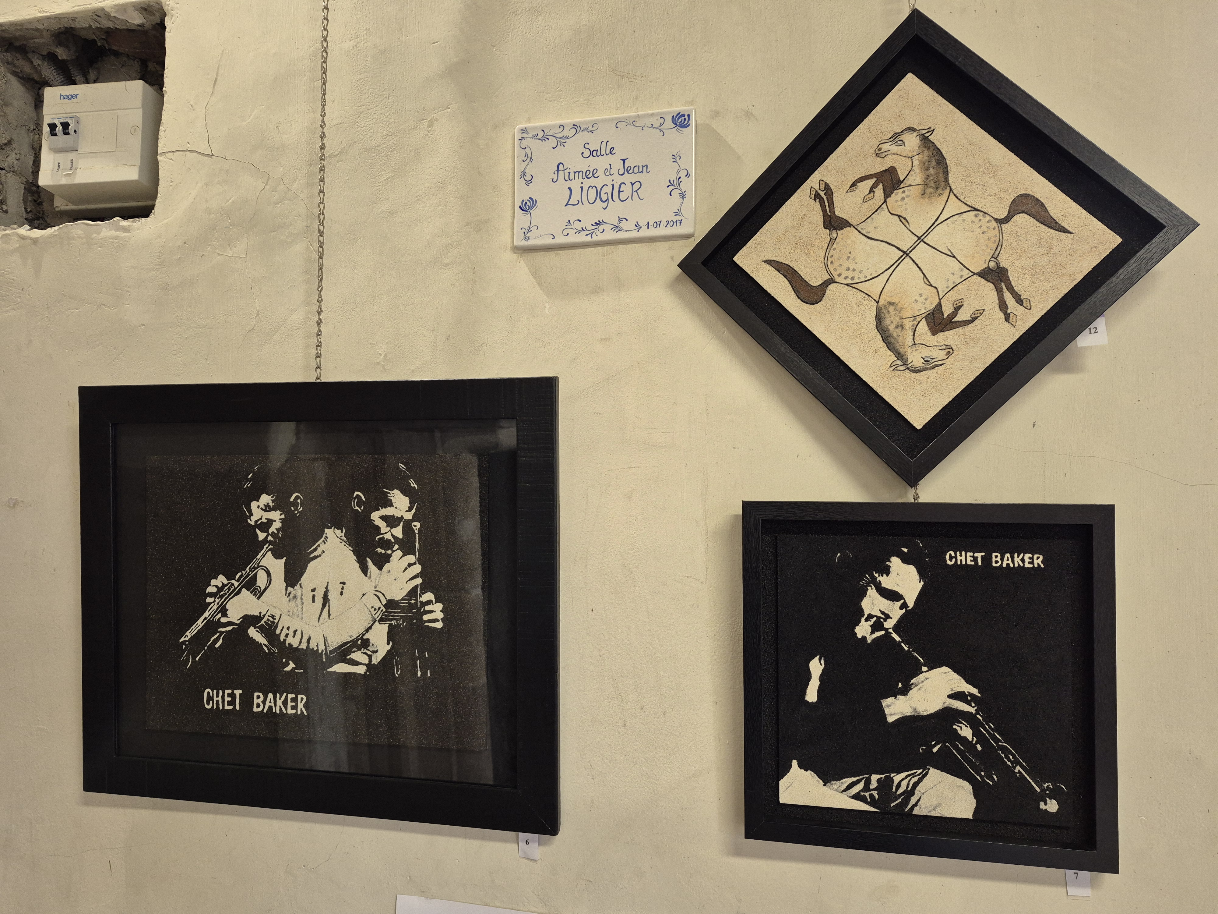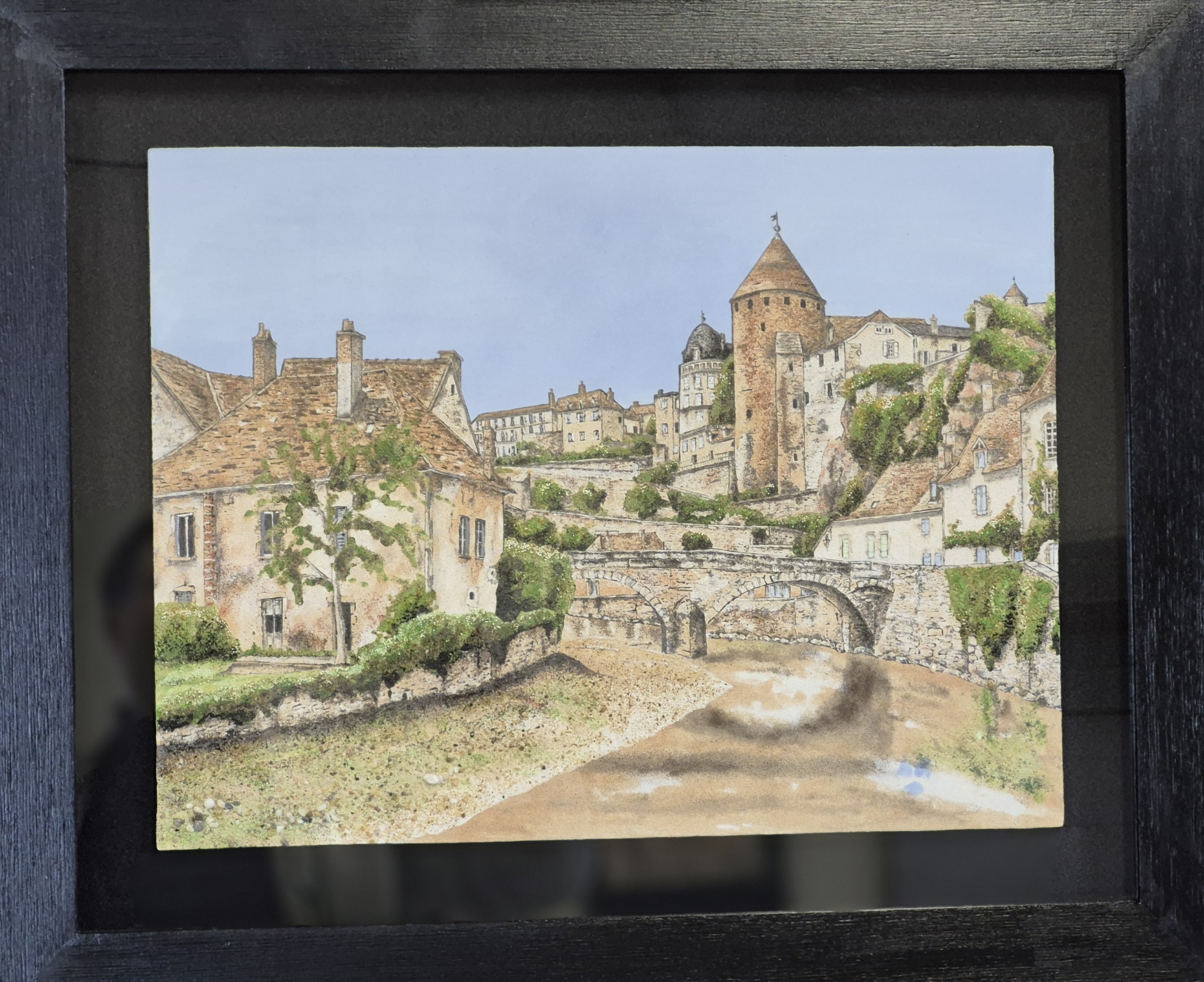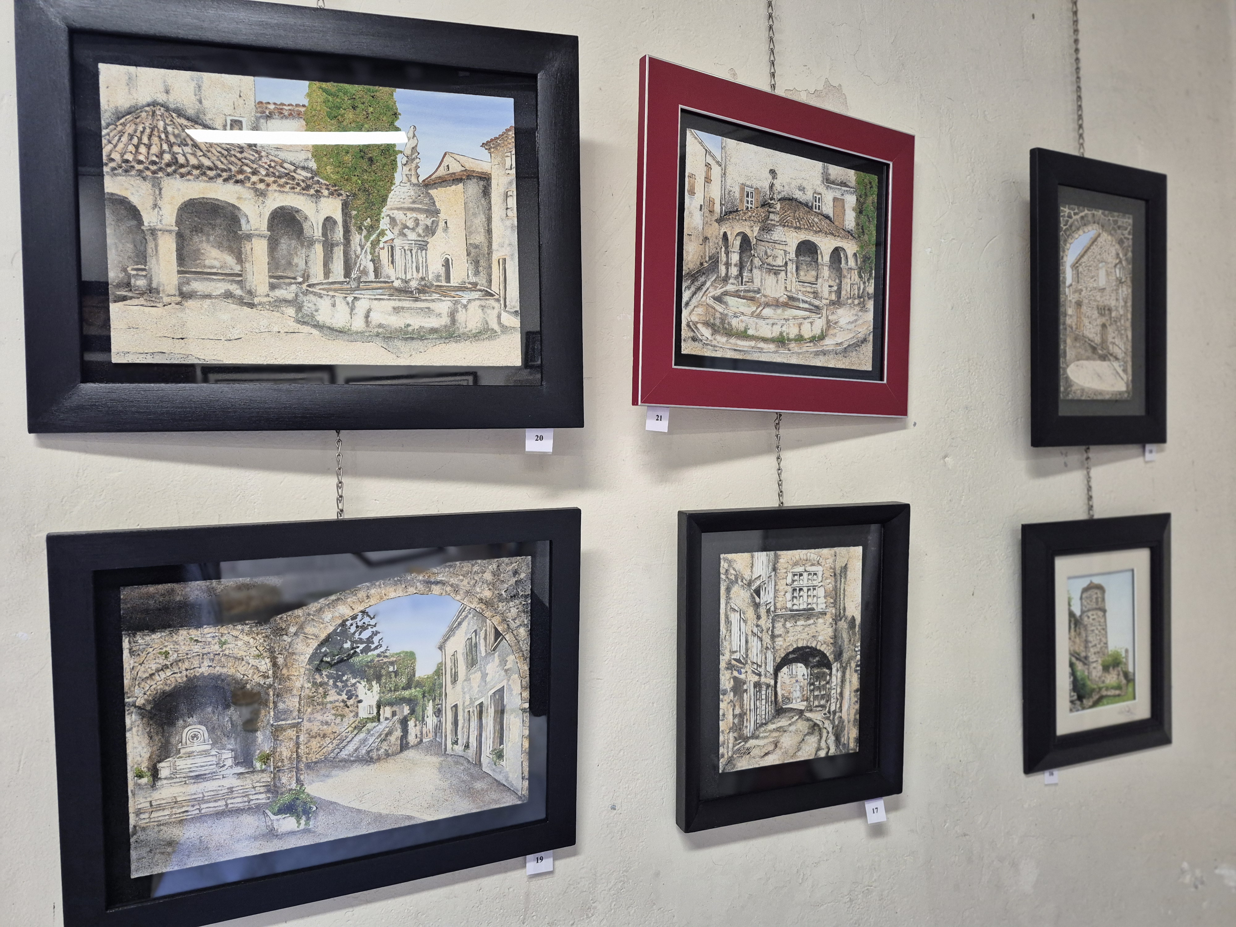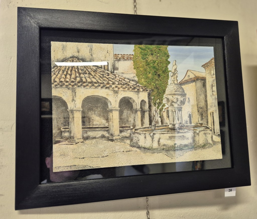 La collection Vieux Villages fonctionne sur un ressort parallèle : les façades de pierre ardéchoises restituées avec des sables locaux. La coïncidence entre le matériau du bâti représenté et celui de la représentation crée une densité que la photographie, pourtant présente dans l’exposition, ne peut atteindre.